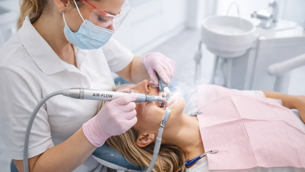 3) Profesionální čištění: Air-Flow, odstranění zubního kamene, dočištění
